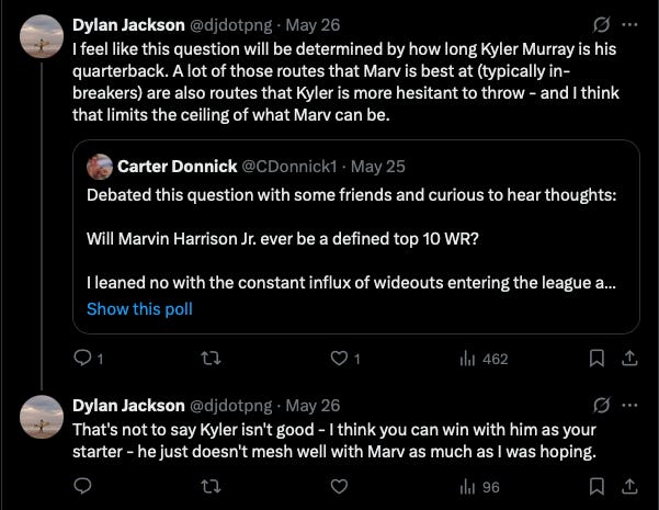 I was super high on this Cardinals offense just a year ago - but I have real concerns about how well Kyler Murray and Marvin Harrison can mesh together. But man… this defense looks really interesting compared to where they were last year.